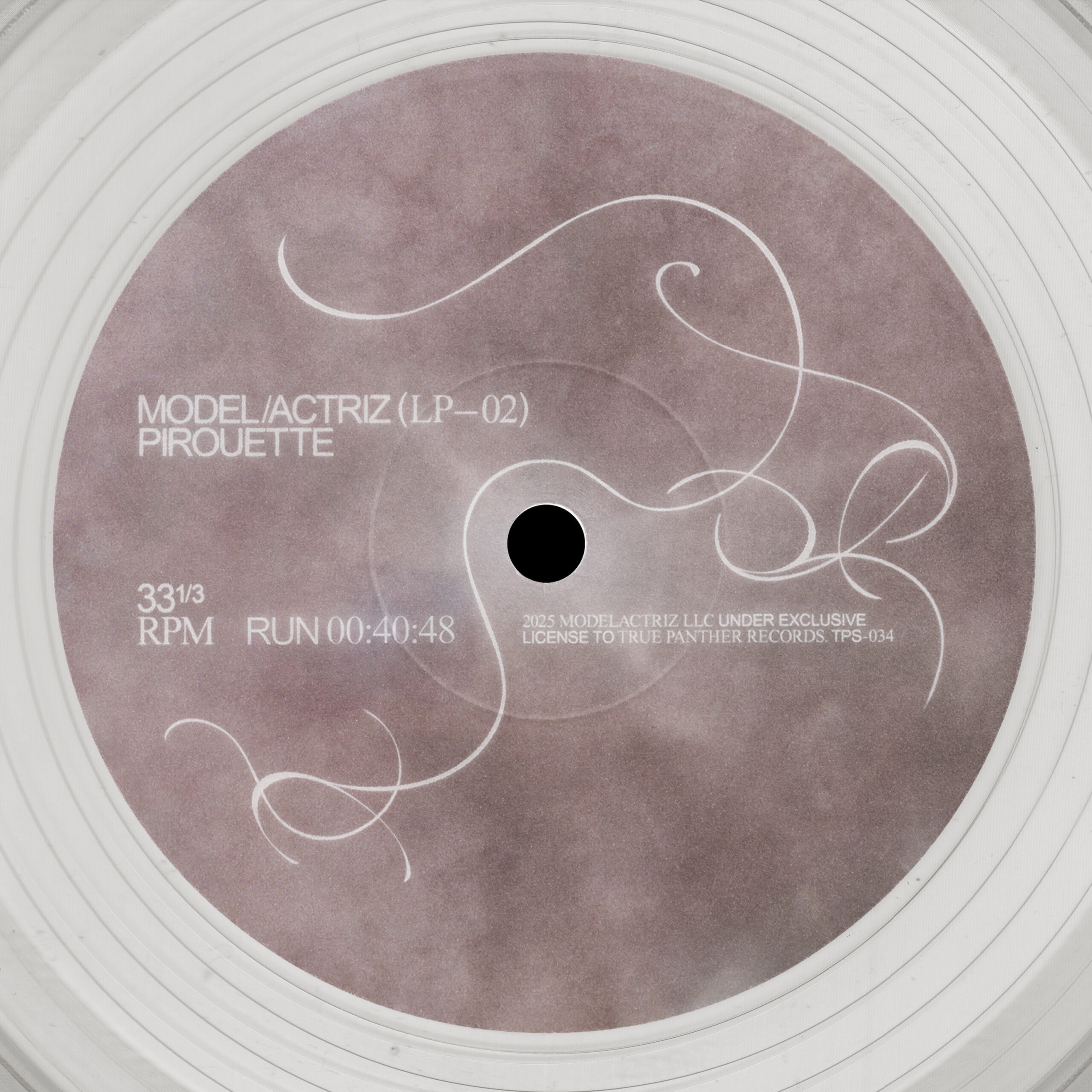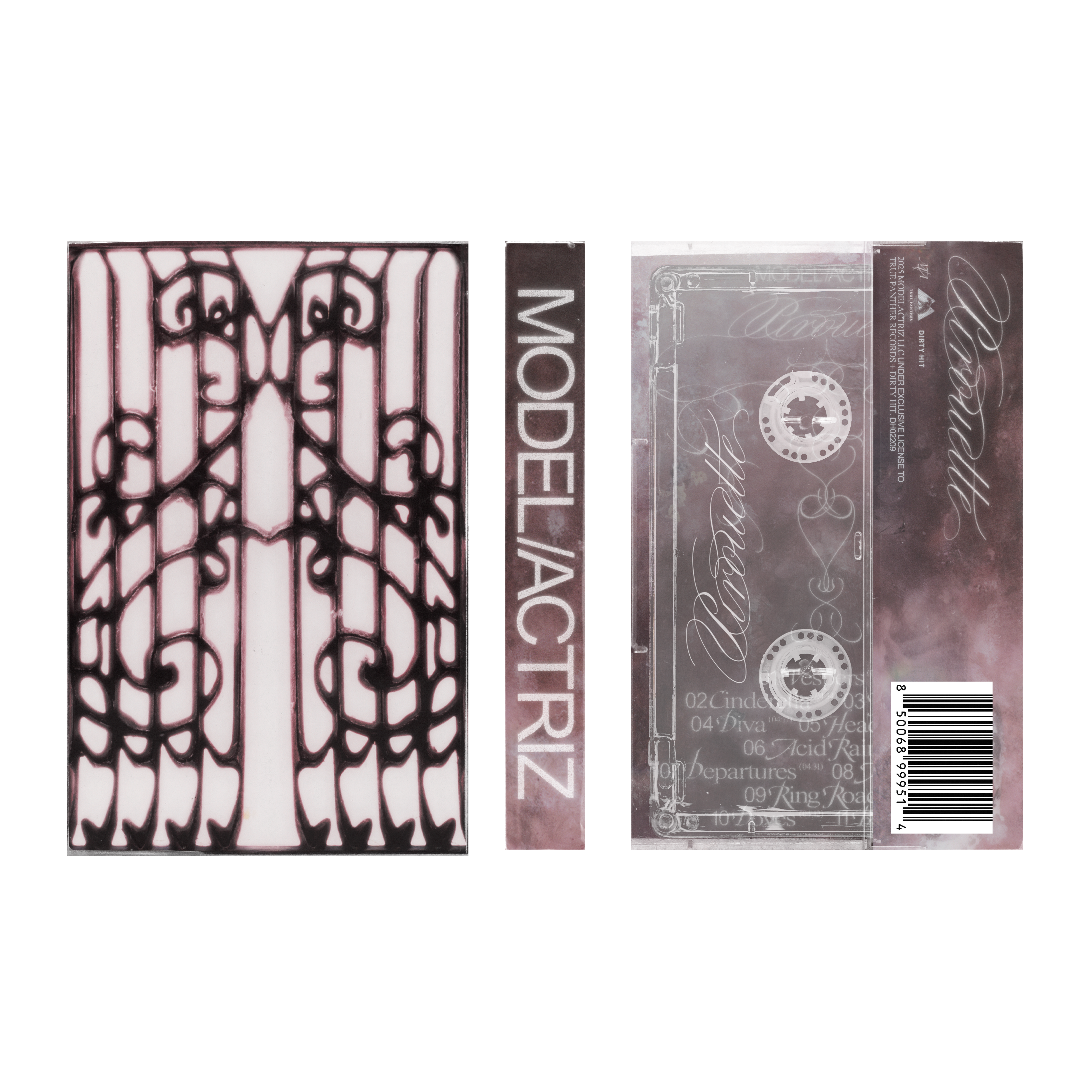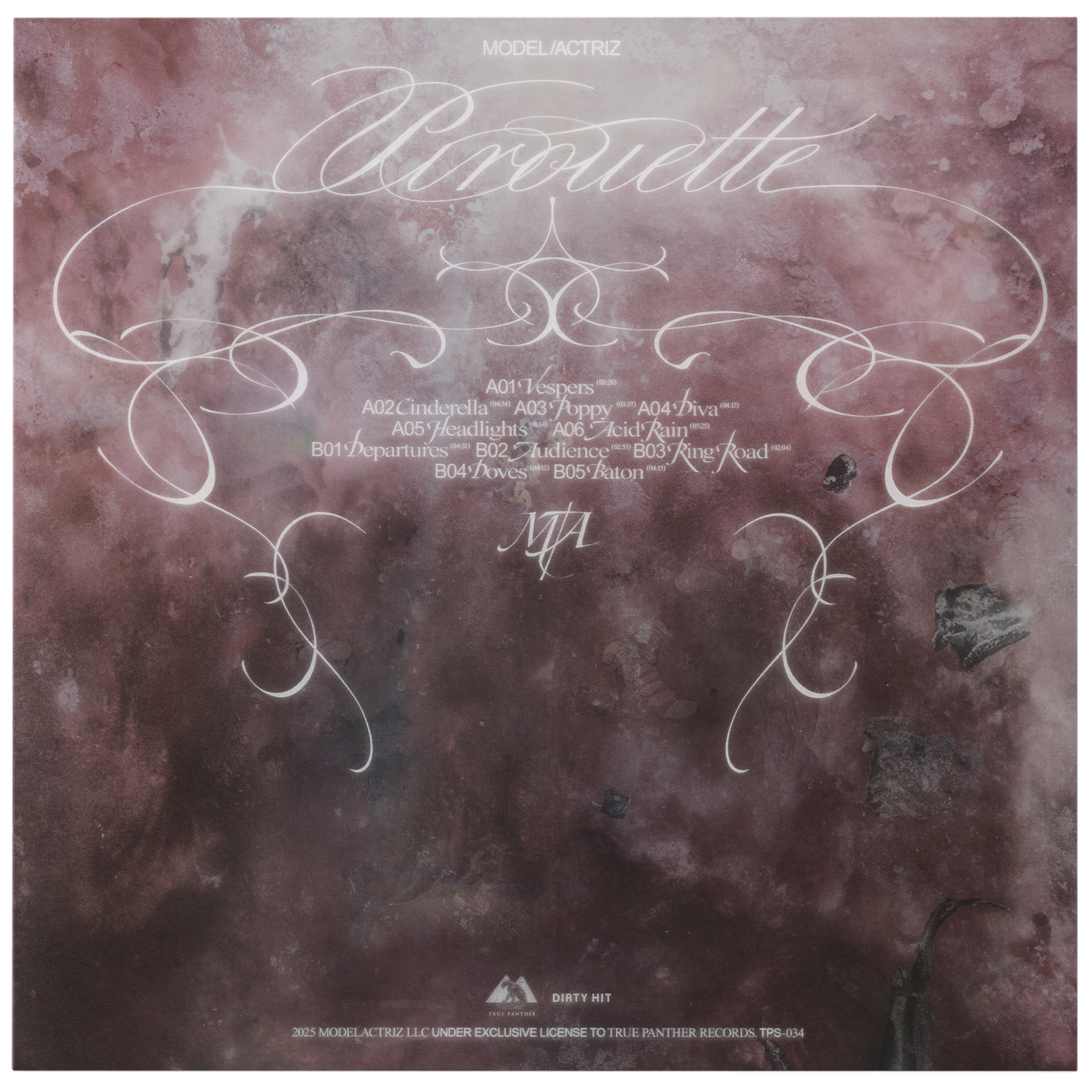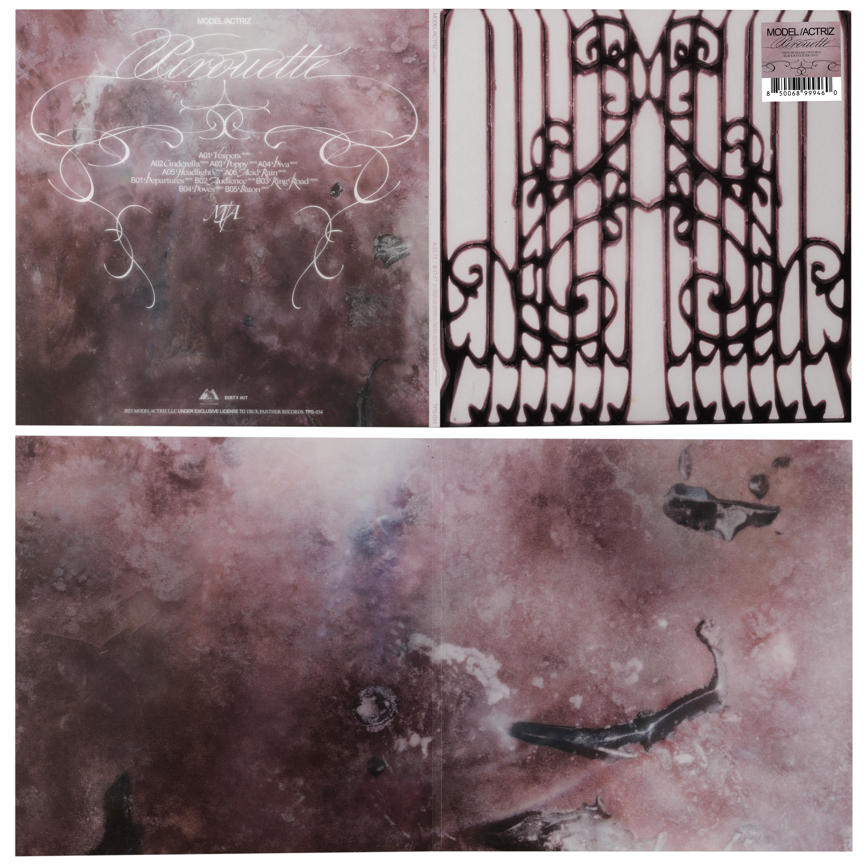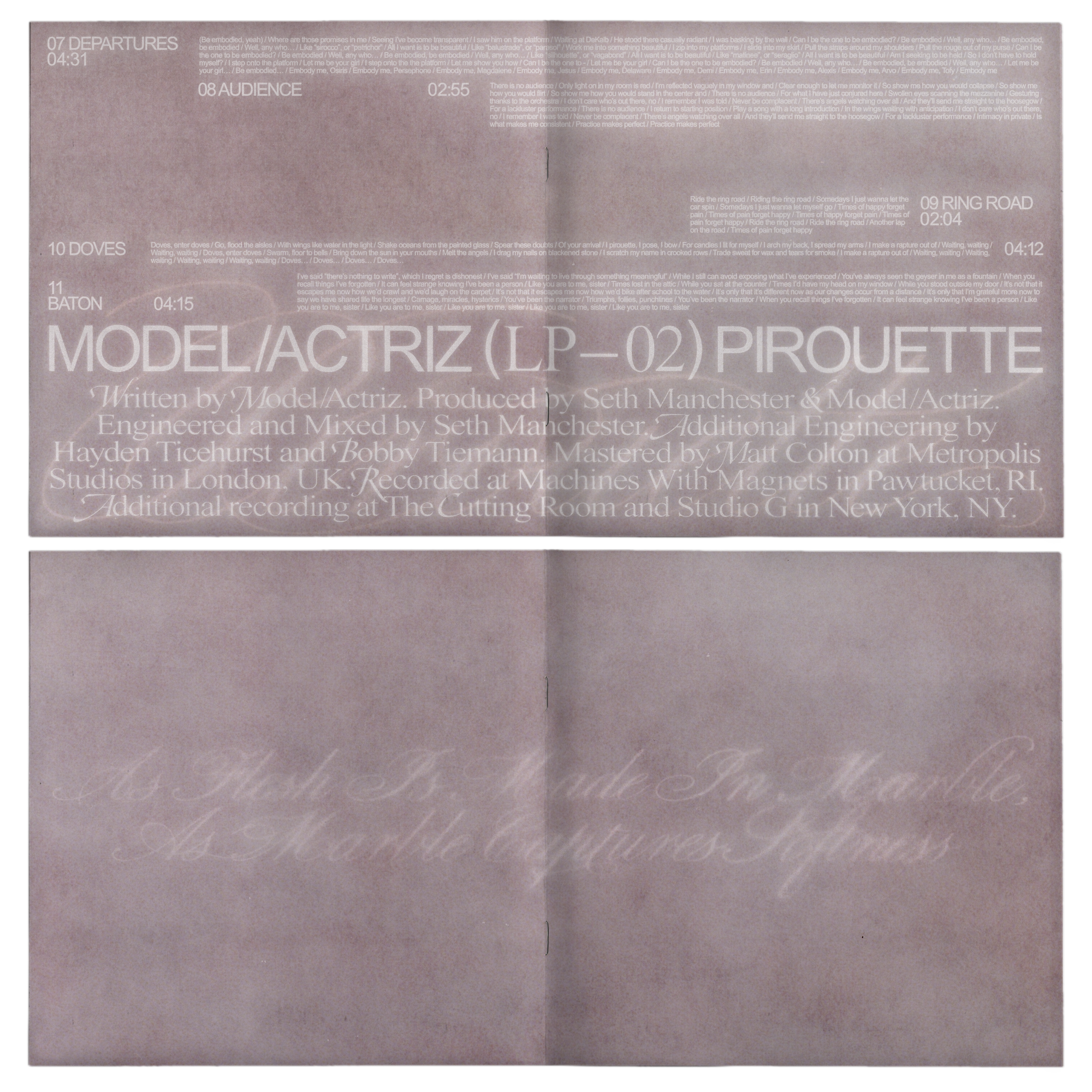 Vinyl, CD, cassette packaging, album artwork, single artwork, merch, posters and live performance direction for Model/Actriz’s sophomore album “Pirouette” (Spring 2025)