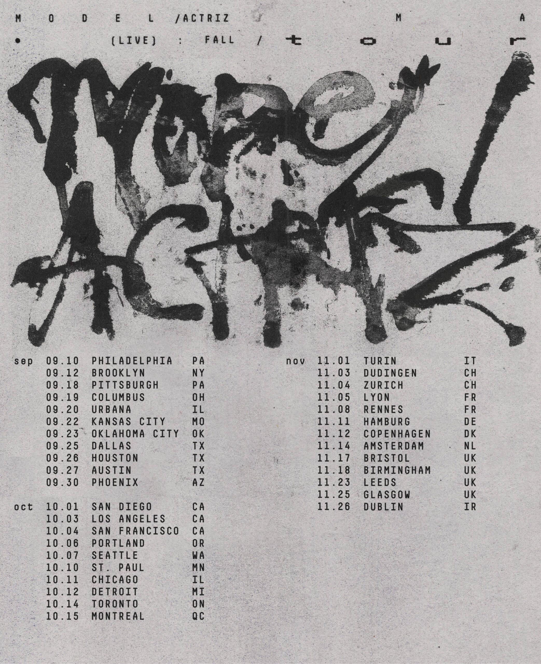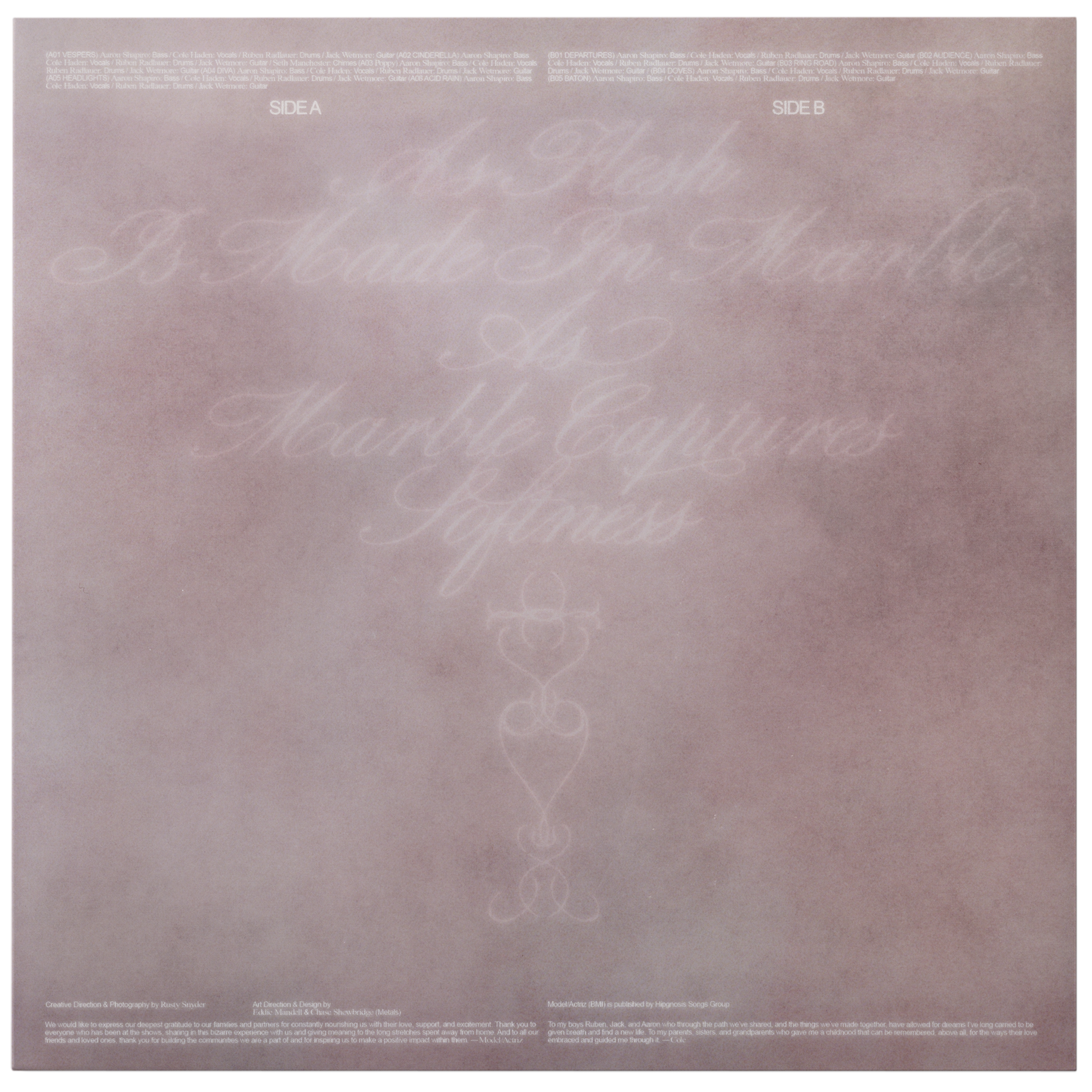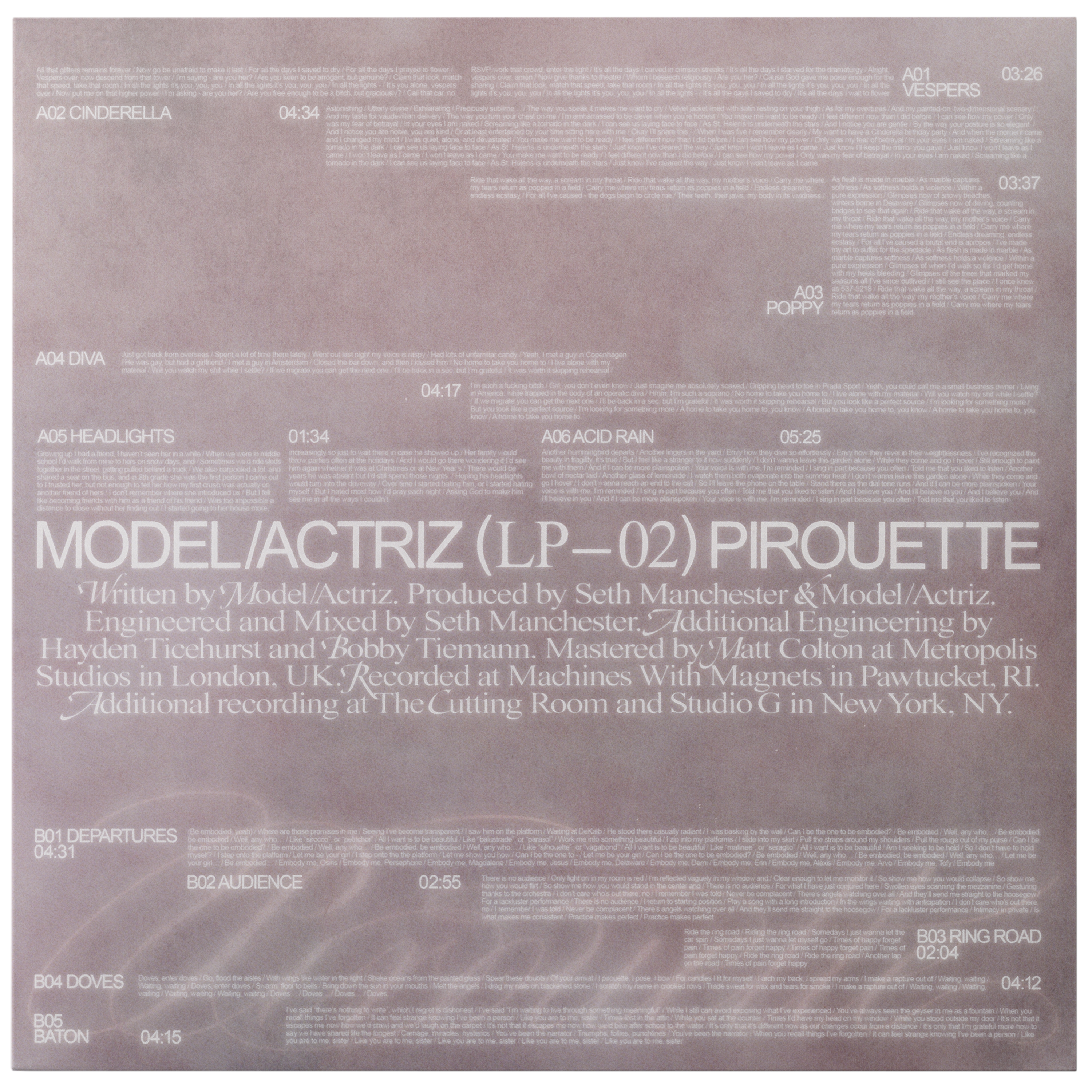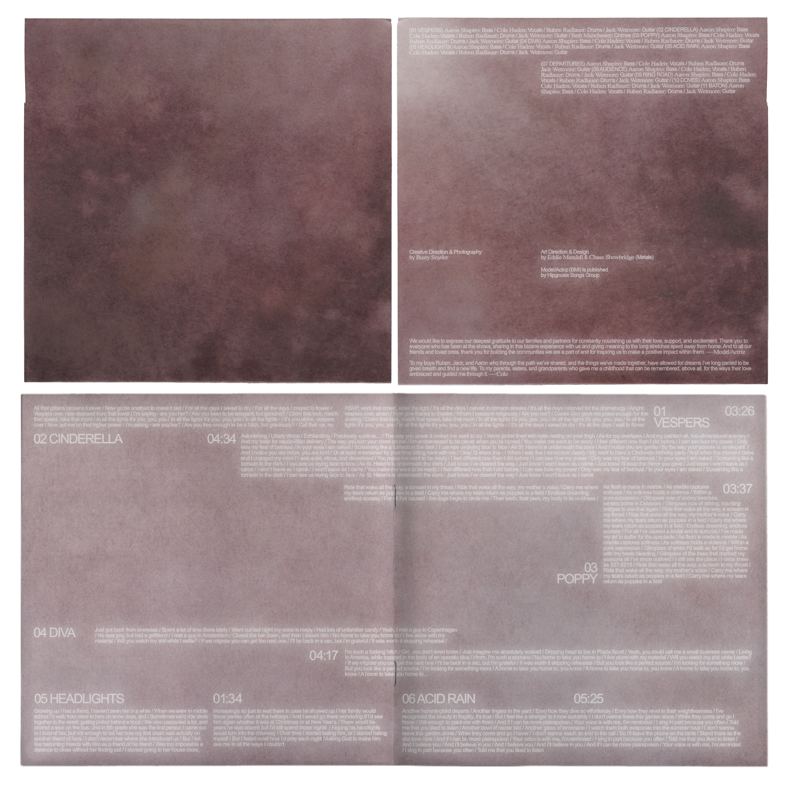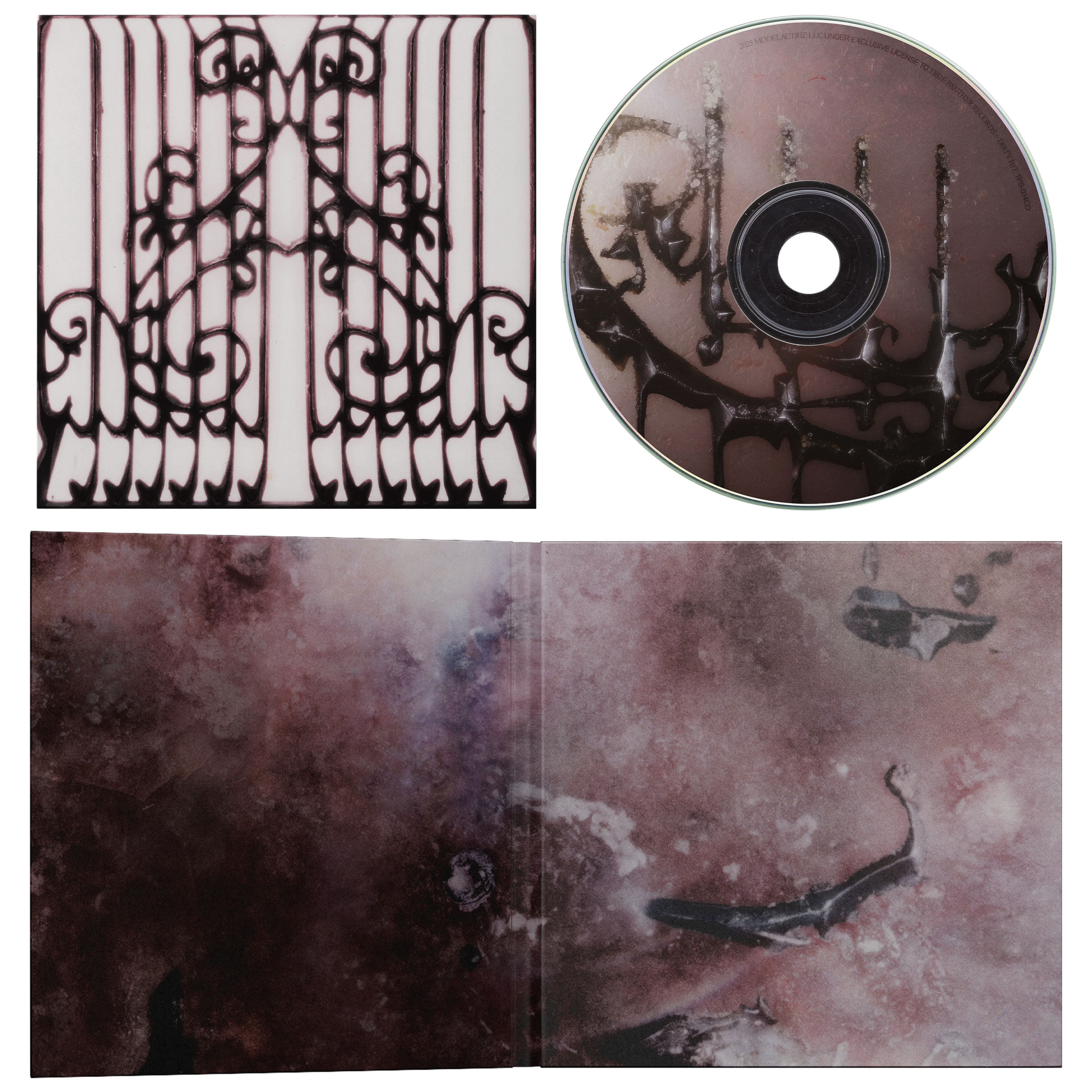 Vinyl, CD, cassette packaging, album artwork, single artwork, merch, posters and live performance direction for Model/Actriz’s sophomore album “Pirouette” (Spring 2025)